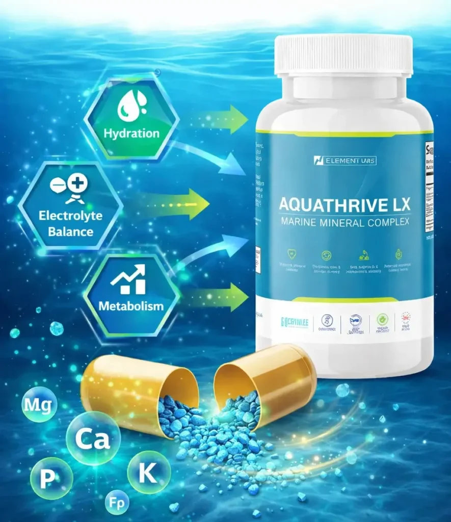 Aquathrive LX works by supplying the body with essential marine-derived minerals that help maintain a healthy mineral balance. These minerals support proper hydration by helping the body regulate electrolyte levels, which are important for normal cellular function and energy production. The formula also supports metabolism and helps the body absorb key nutrients more efficiently. By replenishing important minerals that may be lost through daily activities, Aquathrive LX helps improve overall vitality and supports sustained energy levels. With regular use, it helps the body stay hydrated, maintain electrolyte balance, and support overall wellness, making it a convenient supplement for daily nutritional support.